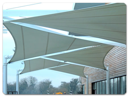 The Hypar series provides a unique design element featuring a twisted membrane with overhead support structure. Modules can be linked together offering a variety of plan layouts. The Hypar is ideal for applications that require a contemporary shade solution with maximum coverage. This range also offers a durable, attractive alternative to traditional shade sails.