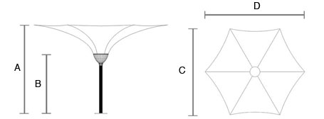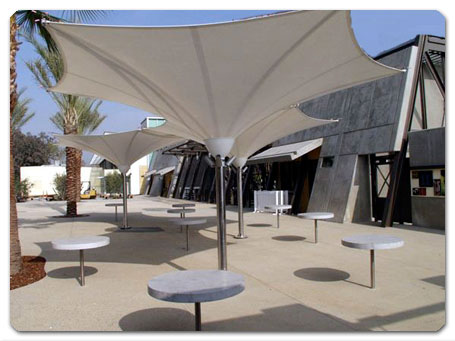 The Lotus is an inverted, hexagonal conical module, with support frames concealed above the waterproof shade membrane. The design incorporates internal drainage so the there is no external drip edges. The Lotus can be clustered in a beehive pattern for stunning architectural effect.